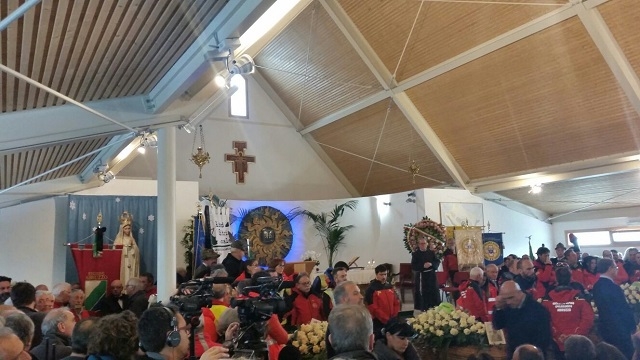 L’AQUILA: – Folla, dolore, lacrime e commozione ai funerali di 4 delle 6 vittime dell’incidente dell’elicottero del 118, precipitato martedì scorso sul monte Cefalone. La cerimonia funebre, svoltasi oggi all’Aquila, nella chiesa di San Bernardino a Piazza d’Armi, officiata dall’arcivescovo metropolita Giuseppe Petrocchi, ha riguardato Walter Bucci, 57 anni di Rocca di Cambio medico del 118; l’infermiere Giuseppe Serpetti, 59 anni di Arischia (AQ); il tecnico di bordo Mario Matrella, 42 anni, di Putignano (Bari) e Davide De Carolis, tecnico del soccorso alpino, originario di Teramo. I funerali delle altre due vittime, Gianmarco Zavoli, pilota dell’elicottero, 46 anni, ed Ettore Palanca, 50 anni, lo sciatore soccorso sulle piste di Monte Felice, si sono tenuti invece a Rimini e Roma.
