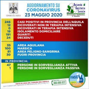 L’AQUILA – Alla data odierna sono 246 i casi positivi al Covid-19 presenti in provincia dell’Aquila, di cui 12 ricoverati non in terapia intensiva, 0 in terapia intensiva e 19 in isolamento domiciliare (di cui 3 in altra Asl).