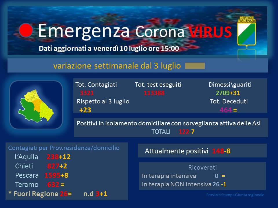 Gli attualmente positivi in Abruzzo (calcolati sottraendo al totale dei positivi, il numero dei dimessi/guariti e dei deceduti) sono 148, con un aumento di 1 unità rispetto a ieri.