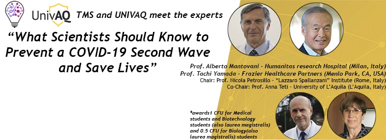 La pandemia da Covid-19 ci ha costretti a rivedere il nostro stile di vita, le nostre abitudini personali e quelle lavorative. Tutti i giorni siamo bombardati da informazioni riguardo il numero di infetti, le tendenze epidemiologiche ed i vaccini sperimentali. Ma quale è la realtà dei fatti? Ci sarà una seconda ondata? Riusciremo a produrre un vaccino efficace? Spesso le informazioni che riceviamo sono imprecise o addirittura errate, perciò il gruppo TMS di Univaq ha deciso di incontrare gli Esperti del settore, in una tavola rotonda nella quale si cercherà di dare un’immagine quanto più vicina alla realtà, e contrastare l’ondata di notizie false che circolano sull’argomento.