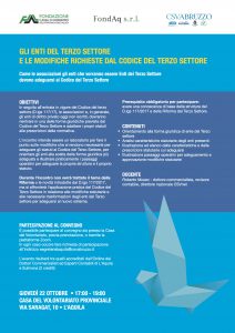 Si tratta di un momento di confronto che servirà a fare il punto sulle modifiche necessarie per adeguare gli statuti degli enti no profit al Codice del Terzo Settore, per orientarli alla scelta della forma giuridica più adeguata e illustrare praticamente i passaggi operativi per conformarsi alla nuova normativa.