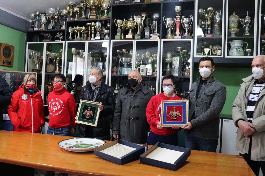 L’AQUILA – Si è svolta in mattinata nella sala ‘A. Autore’ del Museo del Rugby in località Centi Colella la consegna delle ‘Aquile’ realizzate dall’associazione 360° in collaborazione con lo Special Olympics Team alle società sportive Polisportiva L’Aquila Rugby e L’Aquila 1927, omaggiate rispettivamente con il simbolico rapace incorniciato in neroverde e in rossoblù.