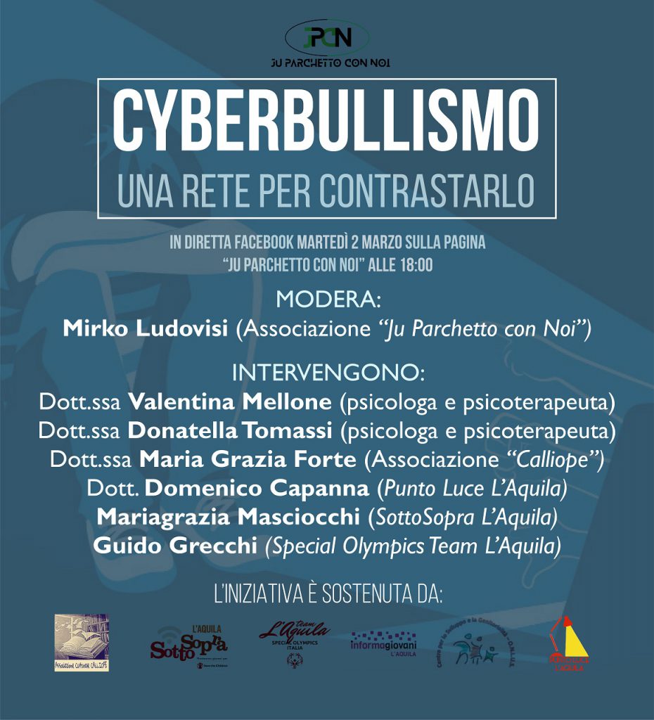 L’AQUILA – L’Associazione Ju Parchetto con Noi e la dott.ssa Valentina Mellone presentano un’iniziativa online di sensibilizzazione contro il cyberbullismo, martedì 2 marzo alle ore 18, che andrà in diretta sulla pagina Facebook dell’Associazione.