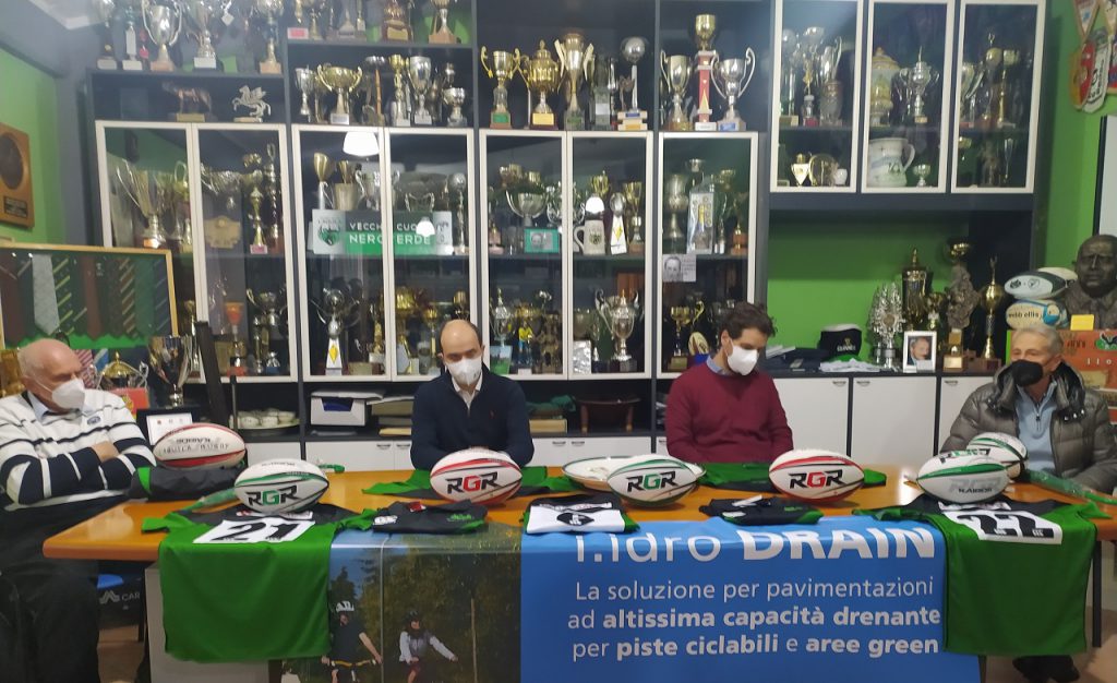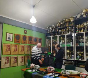 Ai rappresentanti di Italsacci-Italcementi oltre allo Spallone e alla tuta, sono stati consegnati palloni RGR, libro ‘Domenica è Rugby’, maglia del Museo del Rugby, e ombrello neroverde.