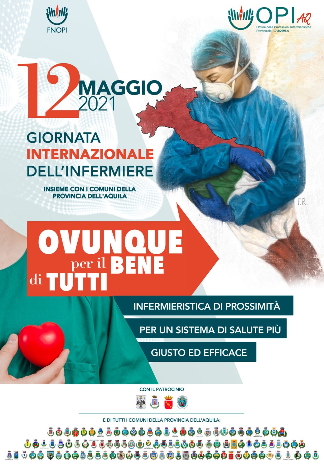 L’AQUILA – Si svolgerà mercoledì 12 maggio la “Giornata Internazionale dell’Infermiere – Ovunque per il bene di tutti – Infermieristica di prossimità per un sistema salute più giusto ed efficace”. Per ricordare l’abnegazione e il sacrificio del nostro personale sanitario soprattutto durante l’emergenza da Covid-19, l’Ordine delle Professioni Infermieristiche della Provincia dell’Aquila ha proposto a tutti i Sindaci del territorio, tramite il Presidente del Comitato ristretto dei Sindaci Pierluigi Biondi e a tutti gli organismi di indirizzo, di controllo e di partecipazione sulle attività socio sanitarie, la possibilità di lanciare insieme un messaggio simbolico volto a ribadire l’impegno di tutti a guardare avanti in questo momento di emergenza non ancora terminato.