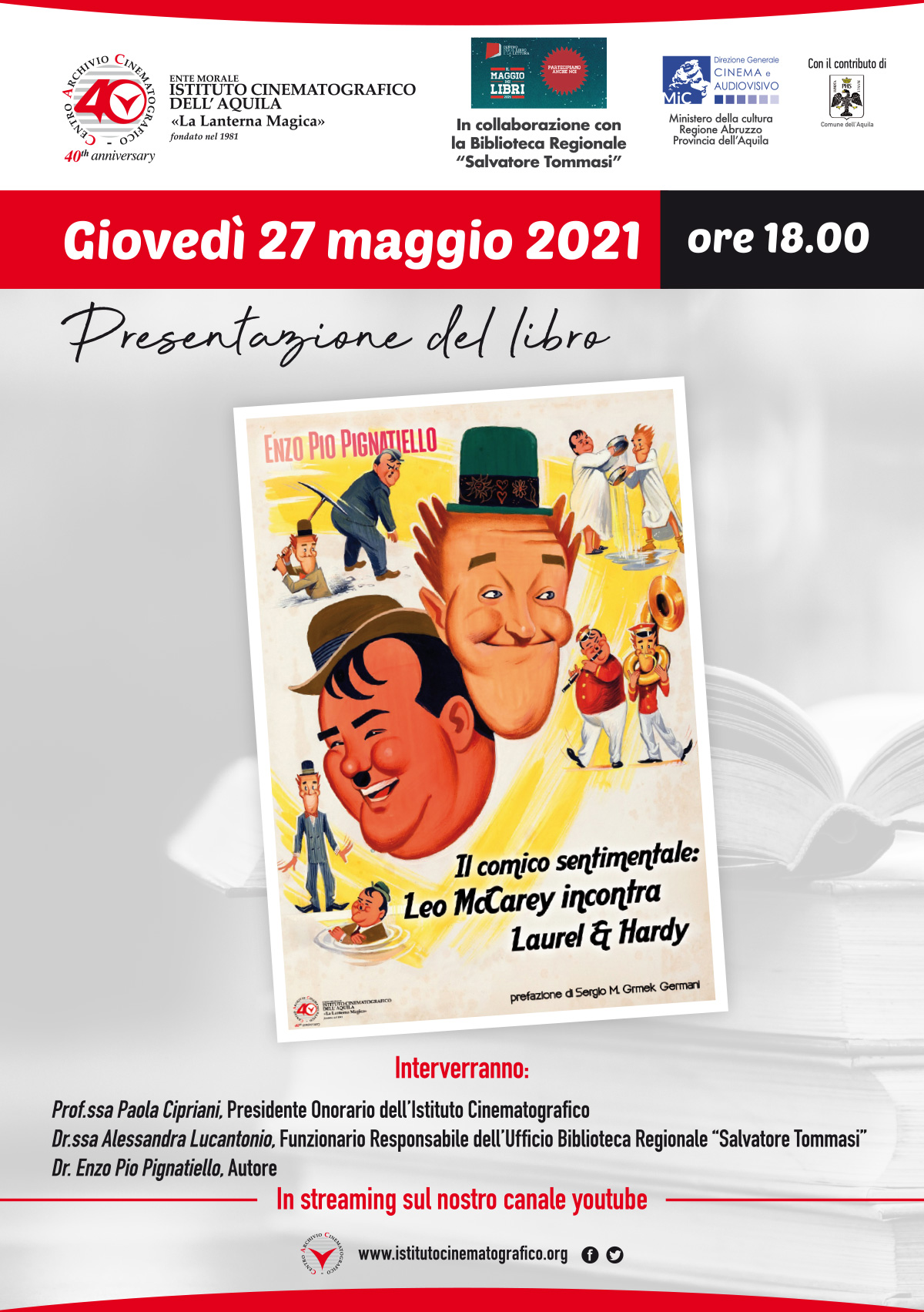 Giovedì 27 maggio, dalle ore 18.00, sarà possibile seguire in streaming, sul canale YouTube dell’Ente, la presentazione del libro Il Comico sentimentale: Leo McCarey incontra Laurel & Hardy con gli interventi della Prof.ssa Paola Cipriani, Presidente Onorario dell’Istituto Cinematografico, della Dr.ssa Alessandra Lucantonio, Funzionario Responsabile dell’Ufficio Biblioteca Regionale “Salvatore Tommasi” e dell’autore Dr. Enzo Pio Pignatiello.