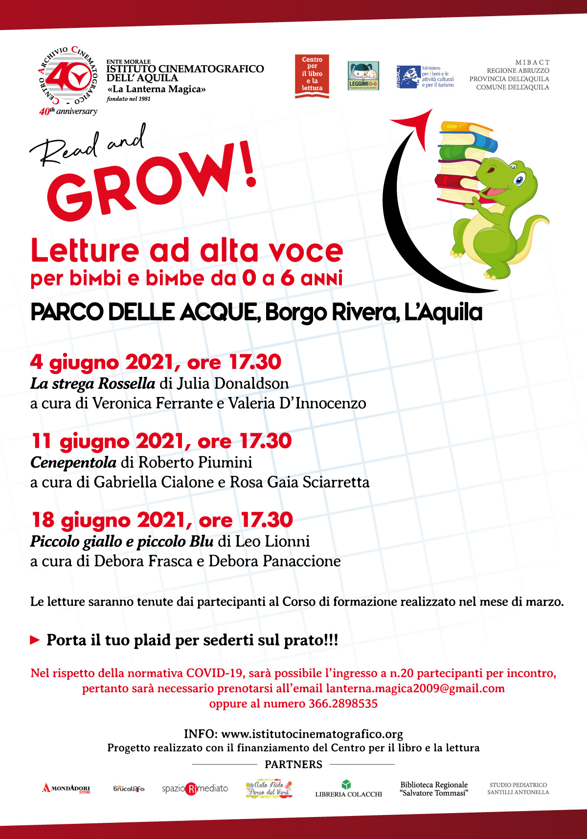 Da domani 4 giugno il Parco delle Acque a Borgo Rivera, L’Aquila ospiterà gli incontri previsti dal progetto Read and Grow!, ideato e realizzato dall’Istituto Cinematografico dell’Aquila “La Lanterna Magica” con il contributo del Cepell, Centro per il Libro e la Lettura.
