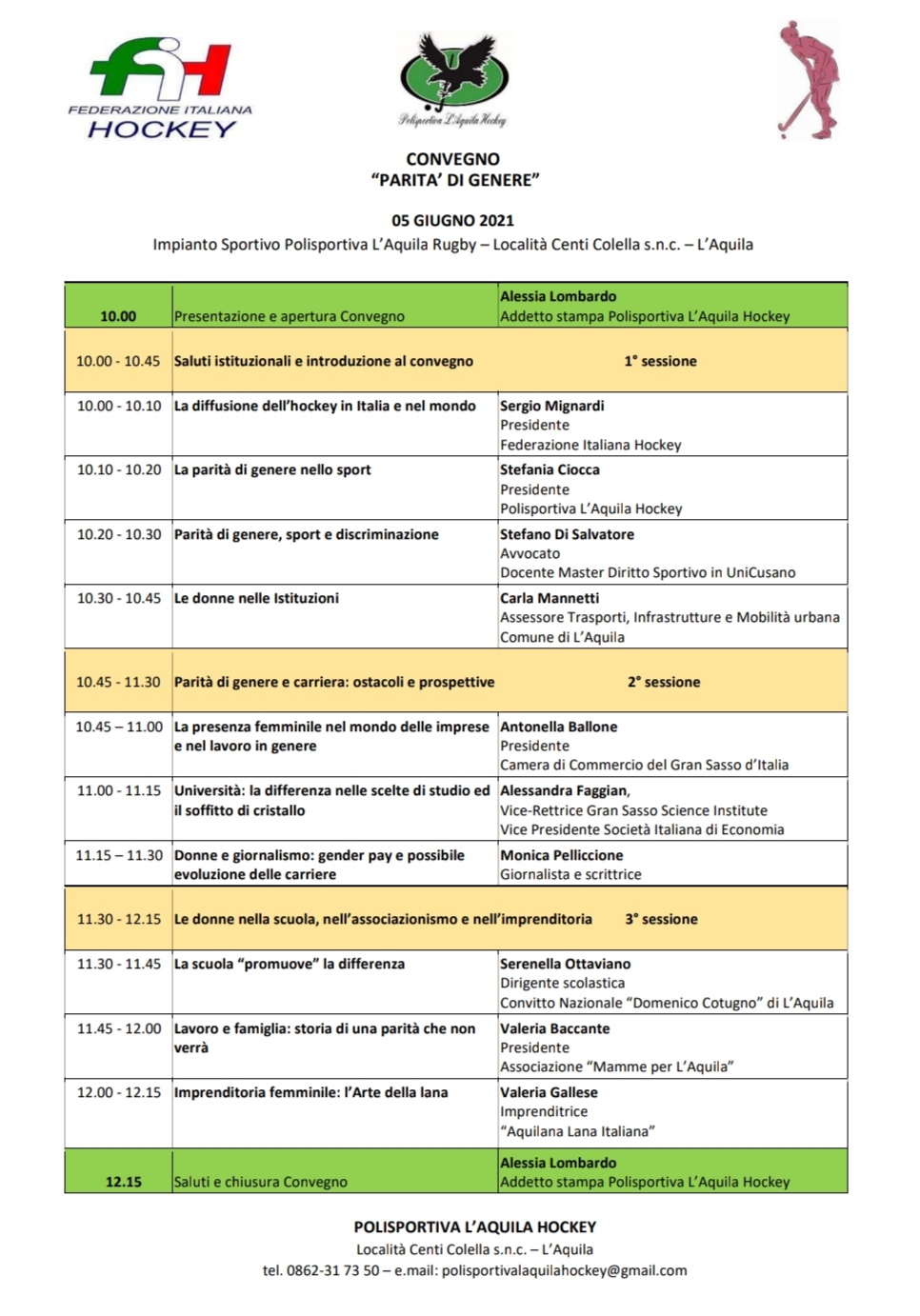 “Alla vigilia siamo pronte a ospitare questa manifestazione anche grazie al sostegno dei fratelli del rugby. Sfidiamo la geografia sportiva e all’Aquila promuoviamo l’hockey su prato – ha spiegato il comunicatore neroverde Alessia Lombardo – Il convegno Parità di genere sarà con un parterre di primo livello composto da donne che costituiscono esempi virtuosi nei rispettivi campi. Non amiamo la retorica, ma la meritocrazia e le sfide. Ecco, l’hockey a L’Aquila è una sfida. Domani ci sarà anche il presidente nazionale FIH Sergio Mignardi e potrà sperimentare di persona tutto ciò. La dedizione e la determinazione di un gruppo in continua crescita. Vi invitiamo, nel rispetto dei protocolli legati al contenimento pandemico, a seguire la manifestazione”.