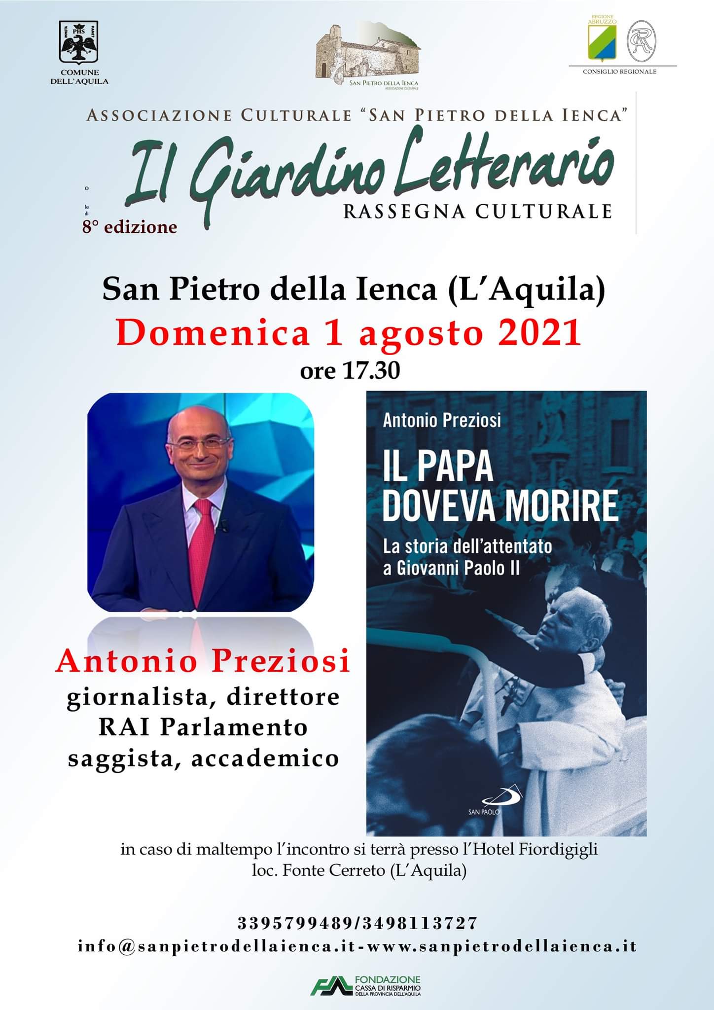 L’AQUILA – Per il sesto incontro della VIII rassegna culturale “Il Giardino Letterario” domenica 1 agosto alle ore 17.30 sarà ospite il Direttore di RAI Parlamento Antonio Preziosi, saggista e scrittore, autore del recente libro “Il Papa doveva morire” edizioni San Paolo.