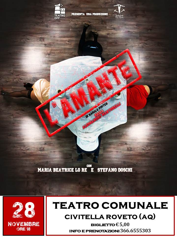 CIVITELLA ROVETO – Prosegue la stagione teatrale organizzata dal Teatro OFF (limits) di Teatranti Tra Tanti presso il Teatro comunale di Civitella Roveto. Dopo il successo dello spettacolo “Con le ali della libertà”, il prossimo 28 novembre, alle ore 18, andrà in scena “L’Amante” di Harold Pinter, con la regia di Alessandro Martorelli e con Maria Beatrice Lo Re e Stefano Doschi.