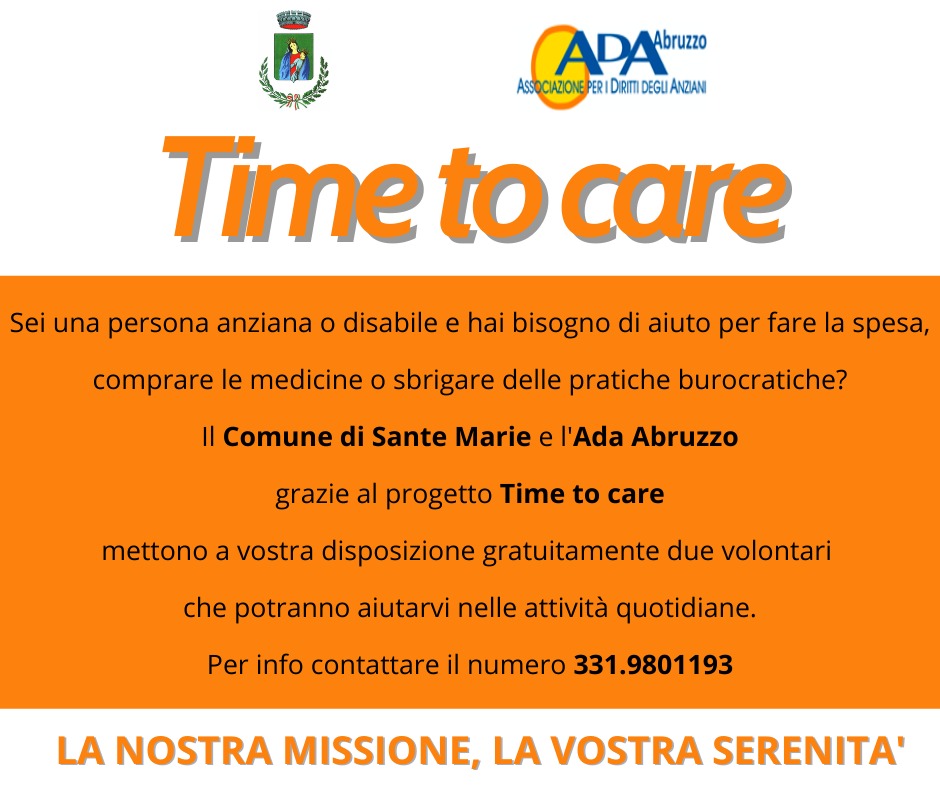 SANTE MARIE – Sei una persona anziana o disabile e hai bisogno di aiuto per fare la spesa, comprare le medicine o sbrigare delle pratiche burocratiche? Il Comune di Sante Marie e l’Ada Abruzzo nell’ambito del progetto “Time to care” volto a sostenere le persone sole, mettono a disposizione gratuitamente due volontari che potranno aiutare i residenti e non in situazioni di difficoltà nelle attività quotidiane.