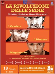 AVEZZANO – Sostituito lo spettacolo “Coppia aperta, quasi spalancata”, previsto per domani 18 febbraio alle 21, a causa della positività al Covid di uno dei protagonisti, che sarà recuperato il prossimo 18 marzo. L’appuntamento del Teatro OFF vedrà in scena, invece, Massimiliano Aceti, Matteo Nicoletta e Federico Lima Roque in “La rivoluzione delle sedie”, con la regia di Barbara Alesse.