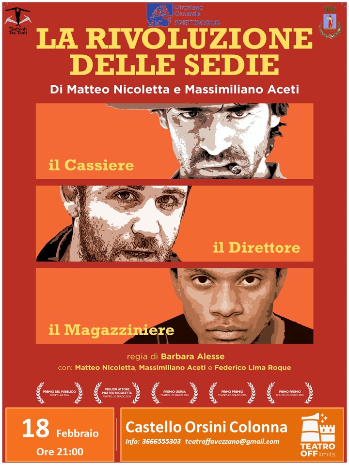 Come ci si comporta con un paraplegico arrogante e prepotente? Siamo in un ufficio del supermercato Eurospin. Luca è il capo del personale della divisione romana, inflessibile e autoritario. Un cassiere, Matteo, entra nel suo ufficio e avanza richieste bizzarre. Luca, stranamente, non lo caccia via. Perché Matteo è seduto su una sedia a rotelle. Ma l’arroganza del disabile è così provocatoria che Luca è costretto a reagire. Da questo primo incontro, che terminerà con il sollevamento di Luca dalla carica di capo del personale e retrocessione a semplice cassiere, inizia tra i due una lotta di potere all’interno del supermercato. Ad osservarli fra gli scaffali, come fosse un arbitro delle loro battaglie, c’è un giovane magazziniere di colore che verrà “usato” dai due come ago della bilancia: l’uomo di colore è l’alleato perfetto per conquistare il potere. “La rivoluzione delle sedie” attraverso un turbine di ritmo e divertimento, svela l’ipocrisia dei normodotati nei confronti dei disabili e verso chi vediamo diverso da noi.