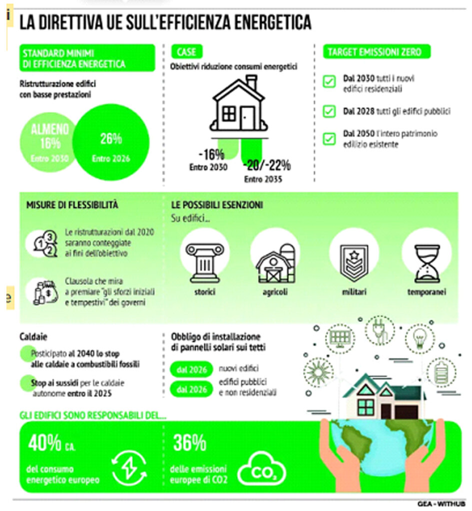 Per quanto riguarda nello specifico i privati, non c’è alcuna imposizione di un obbligo universale di ristrutturazioni edilizie, ma sarà necessario attendere la definizione dei piani nazionali adattabili, che prevedono un intervento medio su tutto l’insieme degli edifici (con i due target al 2030 e al 2035). Saranno dunque i singoli Paesi membri a definire gli standard di rendimento energetico minimo e a decidere quali fabbricati e quale livello di ristrutturazione sarà necessario: potranno concentrarsi sugli edifici più vecchi con classi di prestazione energetica elevate, oppure su quelli di dimensioni più ampie e più inquinanti.