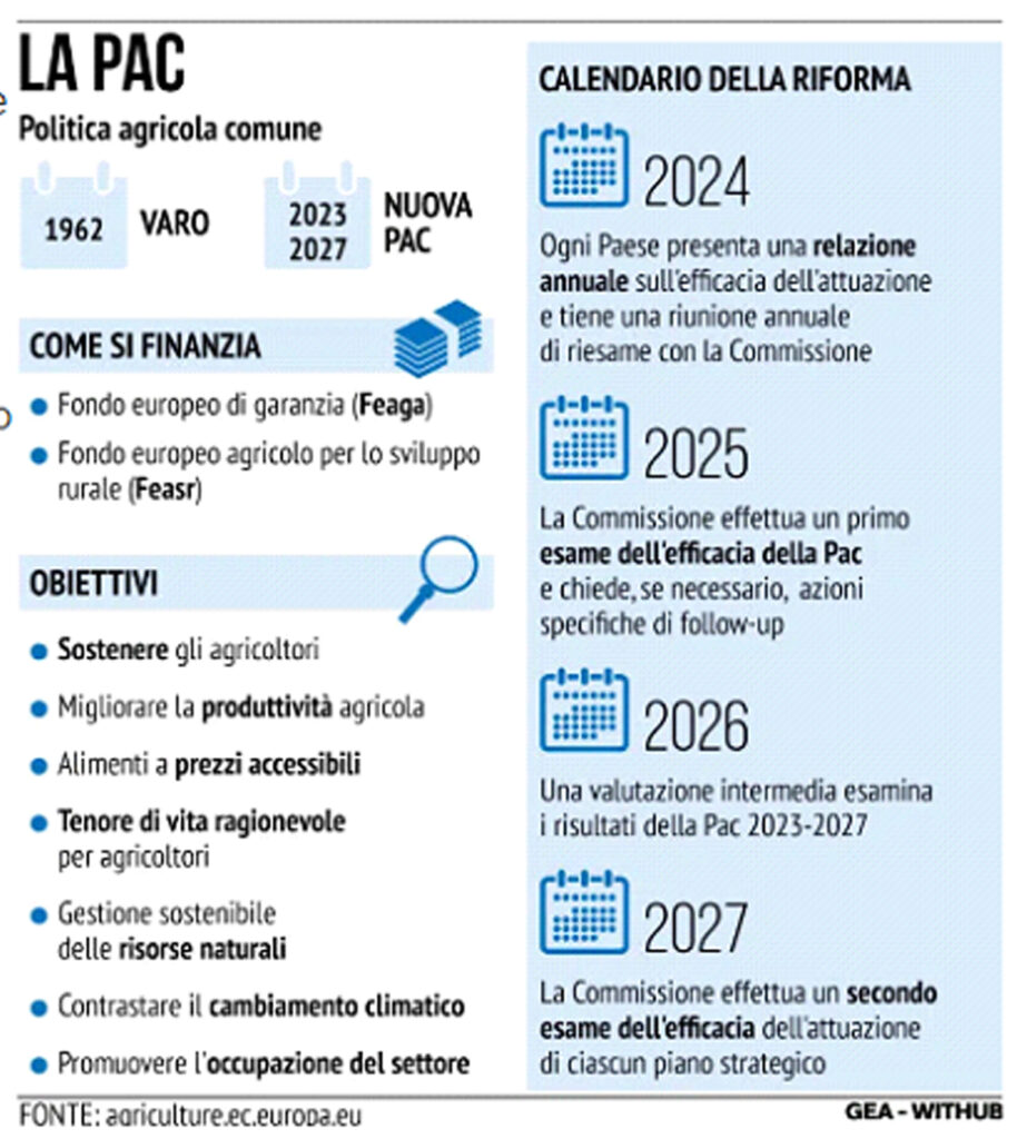 Ricordiamo che la PAC è stata concordata da Parlamento e Consiglio nel 2021 ed è entrata in vigore nel 2023 (con 336 miliardi di euro fino al 2027, circa il 31 per cento del bilancio pluriennale dell’UE).