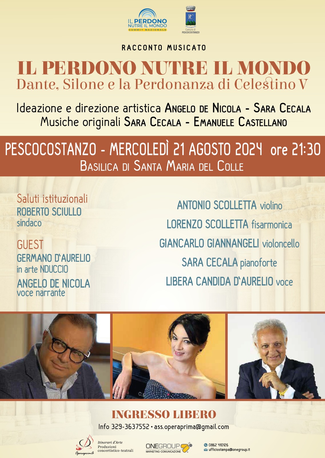 PESCOCOSTANZO (AQ) – Mercoledì 21 agosto prossimo, ore 21.30, all’interno della Basilica di Santa Maria del Colle di Pescocostanzo (AQ) è fissata l’ultima data estiva della tournée 2024 de “IL PERDONO NUTRE IL MONDO, Dante Silone e la Perdonanza di Celesino V”, il racconto musicato ideato dalla pianista Sara Cecala e dal giornalista e scrittore Angelo De Nicola.