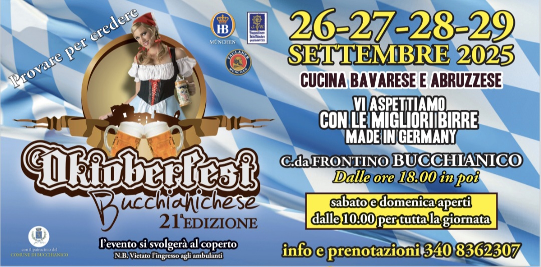BUCCHIANICO – Dal 26 al 29 settembre, Bucchianico si prepara a ospitare la 21a edizione dell’Oktoberfest. Evento con il patrocinio del Comune di Bucchianico (Ch). Un appuntamento imperdibile per gli amanti della tradizione bavarese, che per quattro giorni trasformerà la contrada Frontino in un’autentica festa della birra, del buon cibo e della musica.