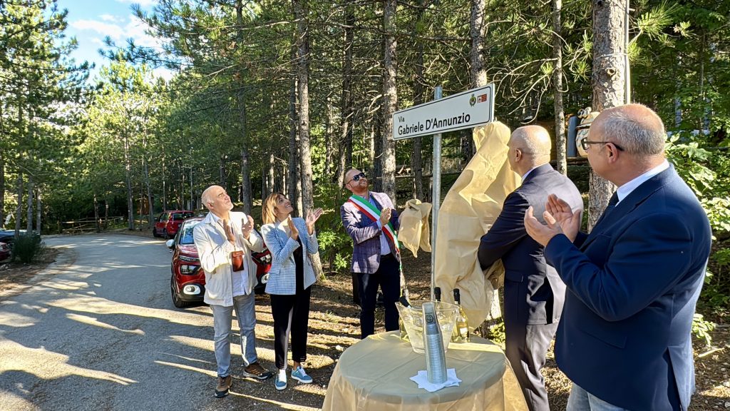 INTRODACQUA – Una giornata di memoria, cultura e identità ha segnato l’intitolazione a Gabriele D’Annunzio della strada che conduce al Monte Plaja, uno dei luoghi più suggestivi e simbolici della Valle Peligna. La cerimonia si è svolta alla presenza del senatore Luciano D’Alfonso, della vicepresidente del Consiglio regionale Marianna Scoccia, del sindaco di Introdacqua, Cristian Colasante, del vicesindaco di Sulmona Mauro Tirabassi e di numerose autorità civili e cittadini.