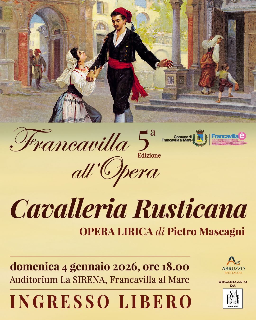 FRANCAVILLA AL MARE – Il Comune di Francavilla al Mare, in collaborazione di BJManagement, presenta la quinta edizione di “Francavilla all’Opera” con un appuntamento storico e per la prima volta invernale: domenica 4 gennaio 2026 alle ore 18:00, l’Auditorium Sirena ospiterà per la prima volta la Cavalleria Rusticana di Pietro Mascagni, in forma di concerto con solisti, coro e pianoforte.