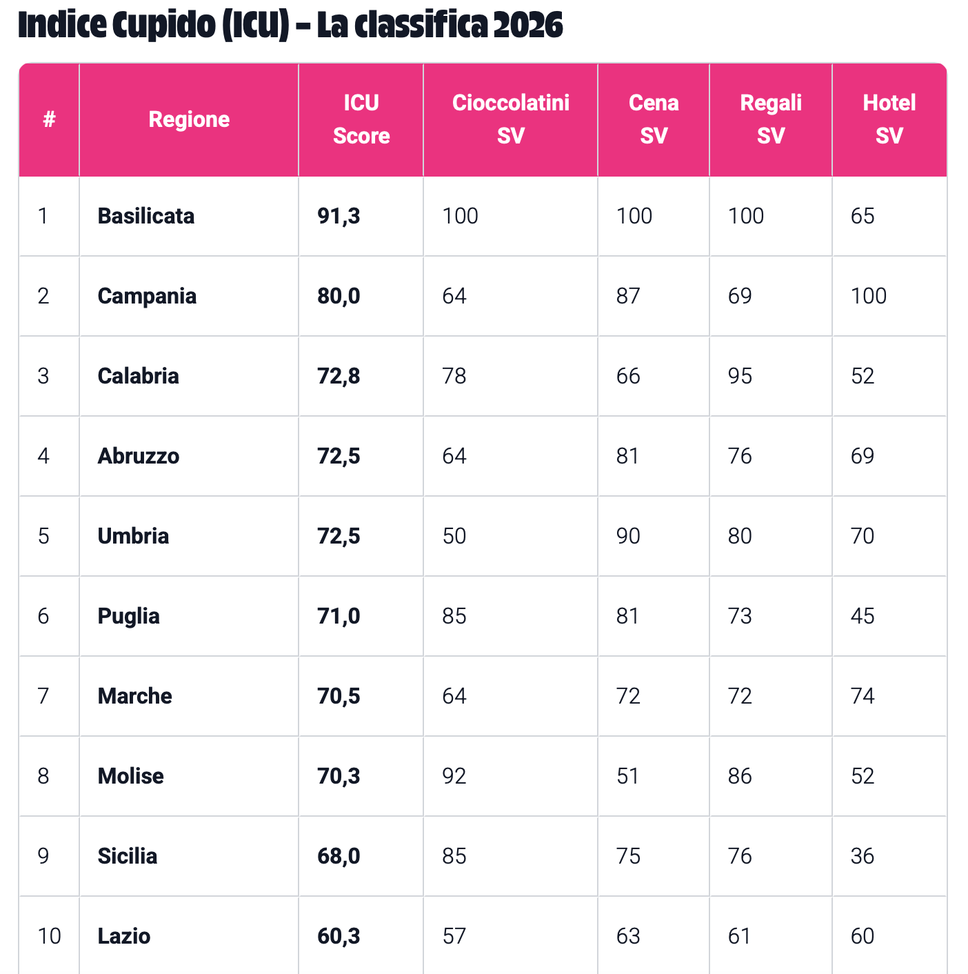 Questo movimento si riflette anche su Google, dove le ricerche legate a cioccolatini, regali, cene romantiche e hotel mostrano picchi ricorrenti già nelle settimane precedenti alla festa. Partendo da questi dati, Casinos.com ha elaborato l’Indice Cupido (ICU), che misura l’interesse regionale verso i principali rituali di San Valentino.