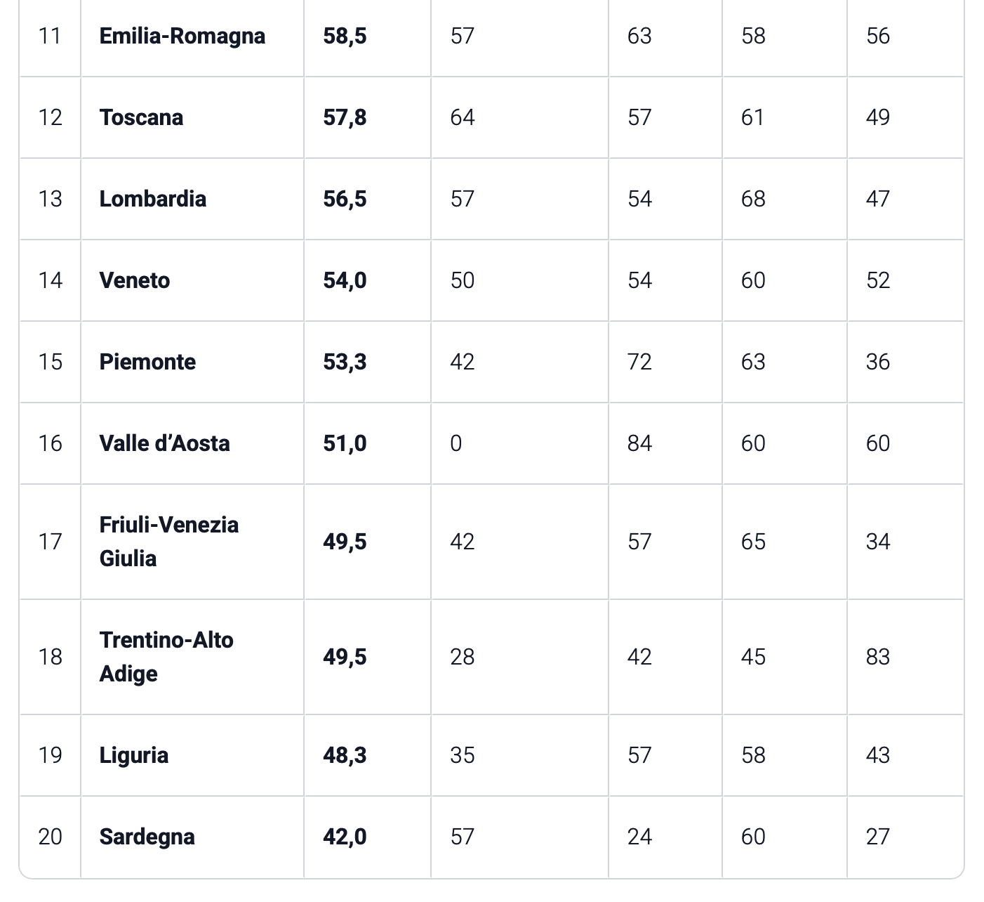 La fascia centrale della classifica resta saldamente meridionale. La Puglia (71,0) brilla per i cioccolatini (85/100) e le cene (81/100), mentre gli hotel (45/100) restano più marginali.