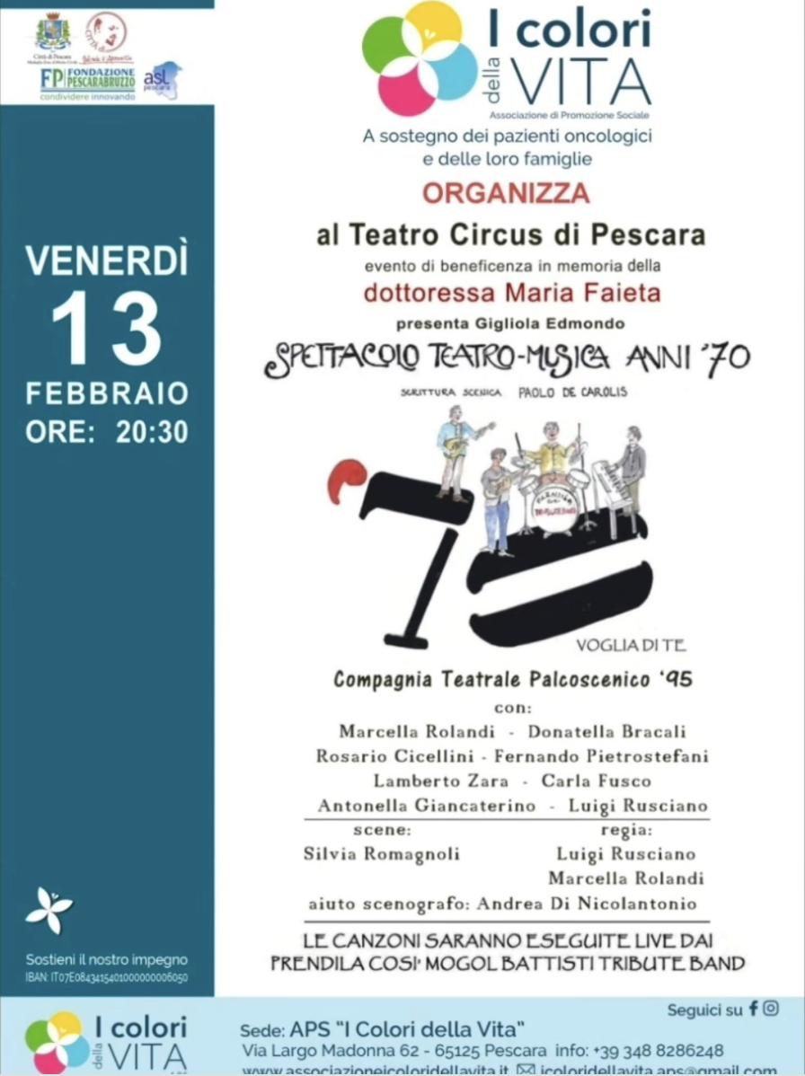 PESCARA – Venerdì 13 febbraio, alle ore 20.30, il Teatro Circus di Pescara ospiterà “Settanta – Voglia di te”, spettacolo di teatro-musica dedicato agli anni ’70, organizzato a sostegno dei pazienti oncologici e delle loro famiglie.