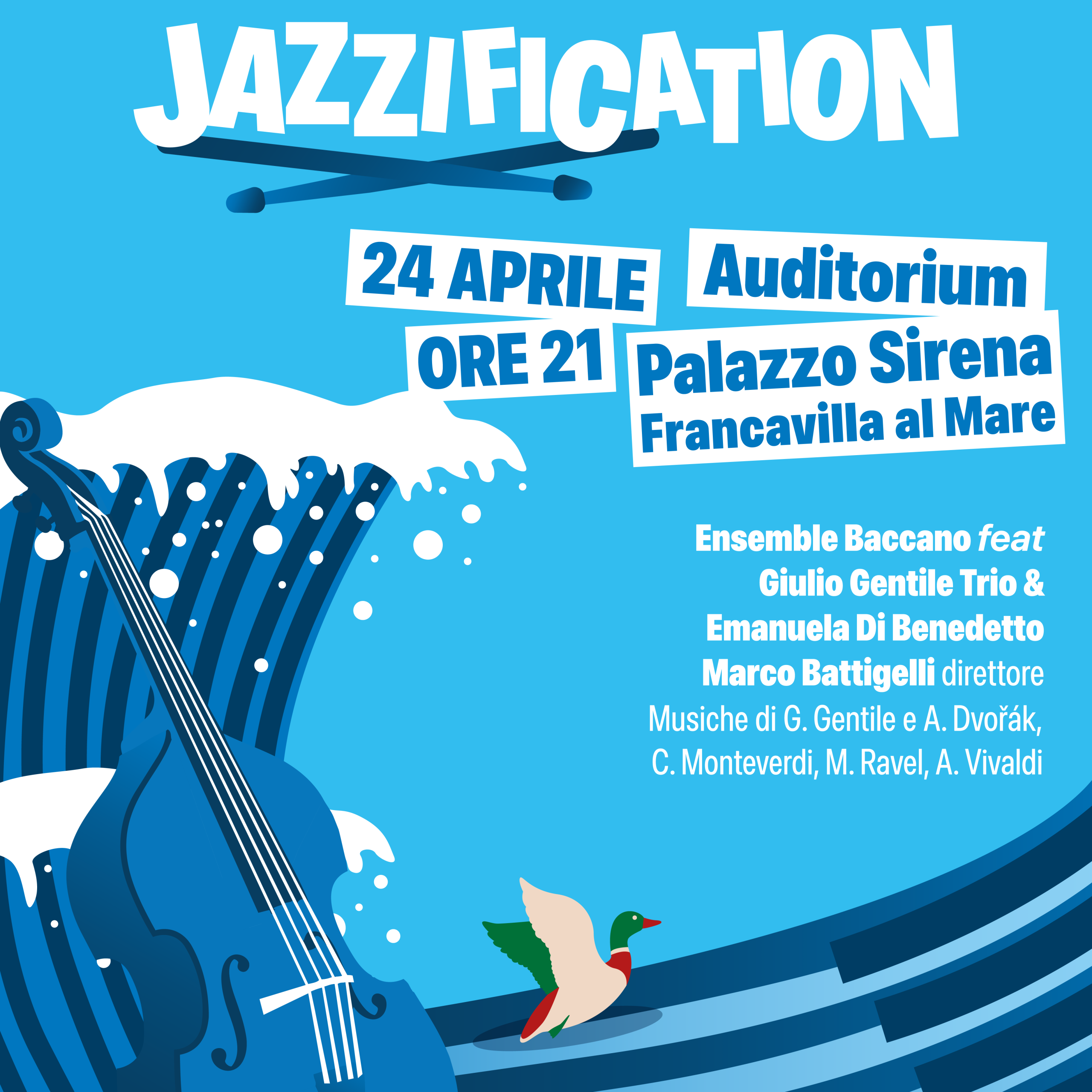 Un concerto che parla di una metamorfosi musicale, ispirata al mare in continuo movimento che fa da sfondo al palco del Sirena. In maniera simile, Jazzification nasce per sfumare le differenze tra generi e creare un intreccio di sperimentazione e innovazione. L’orchestra passa, senza soluzione di continuità, dal jazz alla classica, eseguendo in prima assoluta alcuni inediti del compositore e pianista abruzzese Giulio Gentile, che diventa anche arrangiatore di alcune pagine di Antonin Dvořák, Claudio Monteverdi, Maurice Ravel, Antonio Vivaldi. Una visione che, nella libertà di avvicinare la gestualità del jazz alle sonorità della classica, vuole presentare un materiale musicale vivo, sempre attuale.