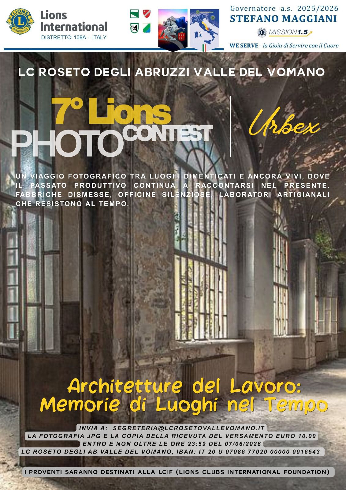 ROSETO DEGLI ABRUZZI – Un invito a guardare con occhi nuovi i luoghi del lavoro, là dove il tempo lascia tracce visibili e invisibili. Torna per la sua settima edizione il Concorso Fotografico promosso dal Lions Club Roseto degli Abruzzi Valle del Vomano, che per il 2026 sceglie un tema evocativo e attuale: “Architetture del Lavoro: Memorie di luoghi nel tempo”.