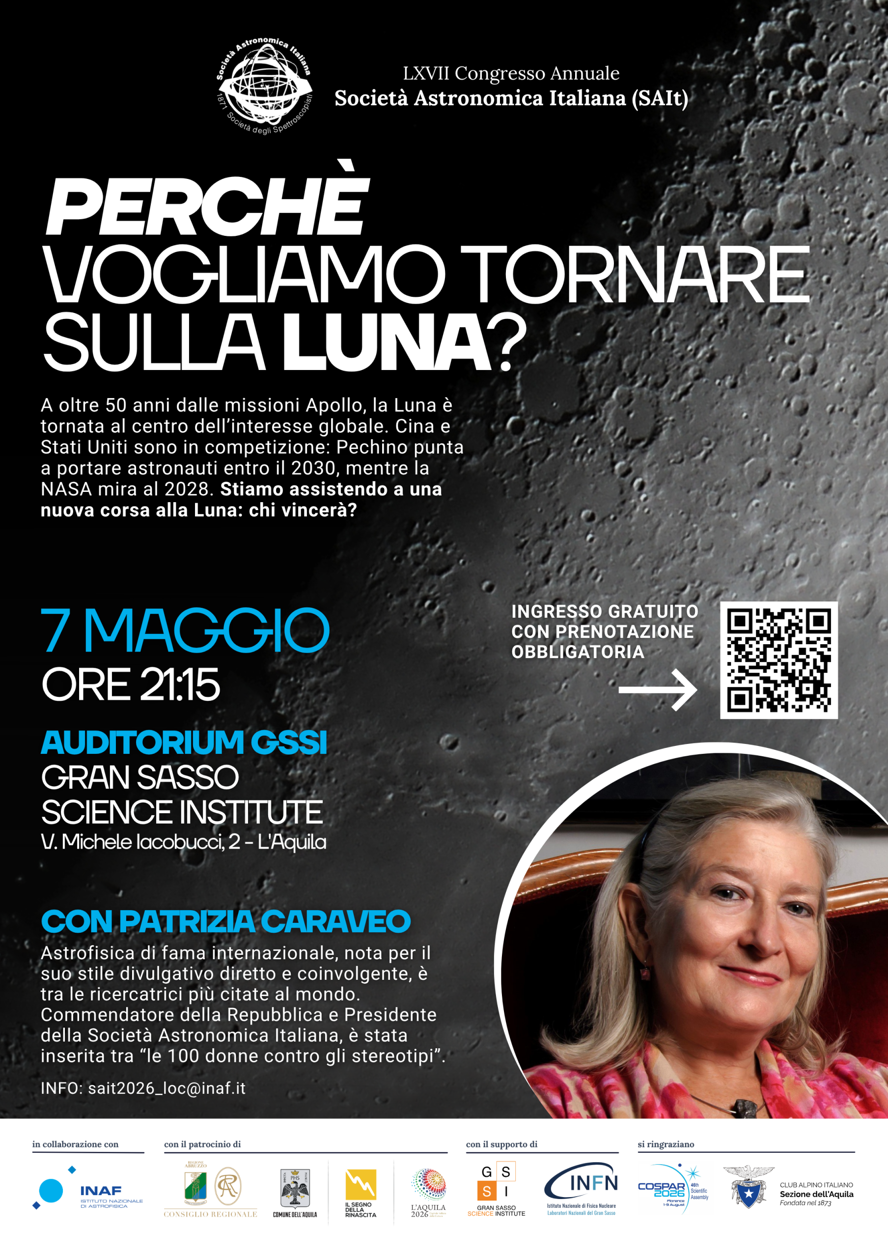 L’AQUILA – Giovedì 7 maggio alle ore 21:15, l’Auditorium del GSSI – Gran Sasso Science Institute all’Aquila ospiterà la conferenza pubblica “Perché vogliamo tornare sulla Luna?” con l’astrofisica di fama internazionale Patrizia Caraveo.