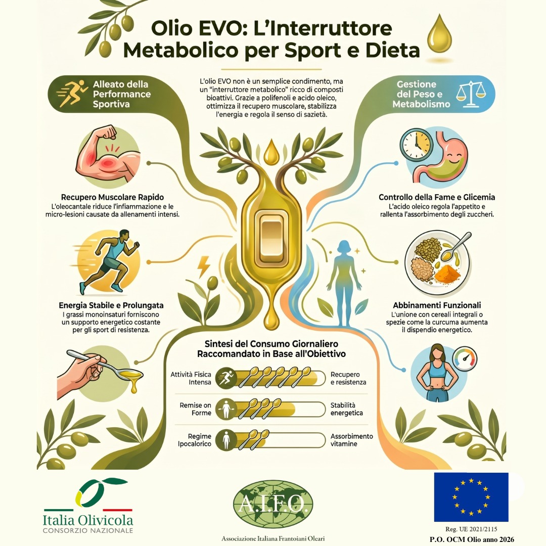 L'olio extravergine, se usato nel modo giusto, è un alleato di sport e dieta: può aiutare a "bruciare i grassi". Non solo quantità: abbinamenti alimentari e qualità dell'EVO incidono su metabolismo, energia e recupero